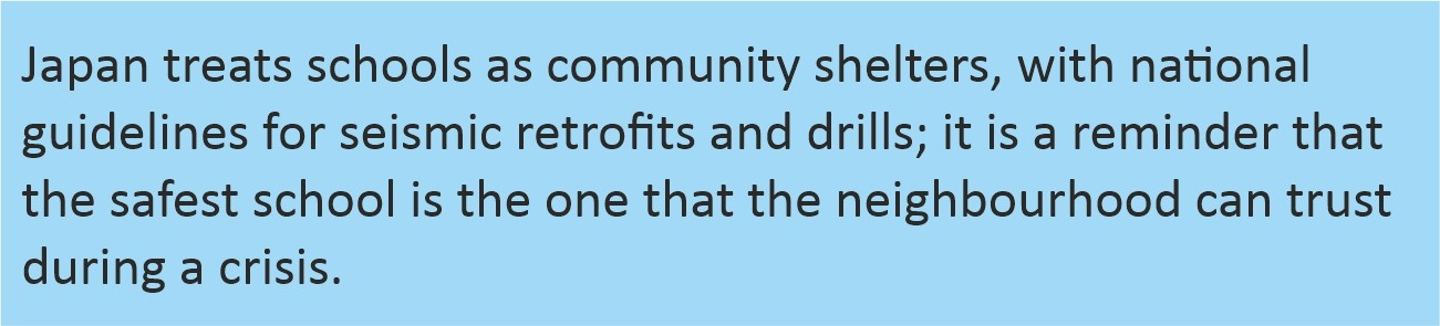 India’s National School Safety Policy transformed disaster management into a daily process by including safety committees, evacuation drills, and structural audits. Even CBSE has tightened school safety by making CCTV cameras mandatory in classrooms, corridors, and playgrounds.