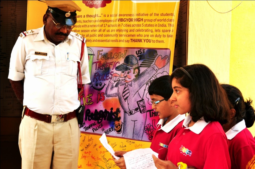 Under this campaign hundreds of VIBGYOR students and teachers from the VIBGYOR network of 17 schools in 7 cities, visited the local offices of different community / public services departments such as police stations, hospitals, fire-brigade, municipal ward offices etc. to thank these work forces and expressed gratitude for their uninterrupted services 365 days a year to so that we citizens are able to enjoy our holidays and festivals safely and peacefully.